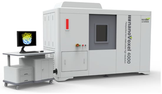 Figure 3 shows the X-ray micro-CT scanner (nanoVoxel-4000, Tianjin Sanying Precision Instrument, Tianjin, China) used in the present work. When scanning the carbonate rock, the resolution of the image was set to 61.75 μm with the voltage of X-ray tube set to 180 kV. However, the aforementioned settings were not feasible for the sandstone sample as the obtained images were blurred. This is because the X-rays are unable to penetrate the sample due to the compaction of grains in the sandstone. Therefore, a higher resolution of imaging (30.45 μm) and a higher voltage of X-ray tube (200 kV) were adopted when scanning the sandstone sample.