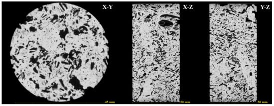 Images of the cross sections of specimen, as shown in Figure 6, are obtained when CT scanning is performed along different directions. In each cross sectional image, pixels with different gray levels indicate pores and solids. To reconstruct the 3D model of pores and solids in the specimen out of the cross sectional images, Dragon fly (Object Research Systems, Canada) was applied.