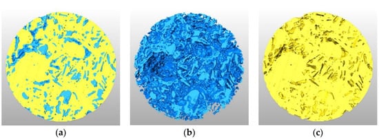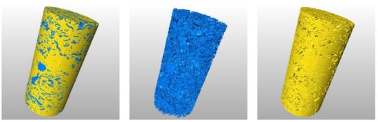 Figure 7a shows the 3D reconstructed model of the cylindrical sample A, from which the 3D models of the pore network (see Figure 7b) and the solid phase (see Figure 7c) can be extracted. As a result, the volumetric fractions of the pore and the solid can be determined and they are listed in Table 2 for all the samples.