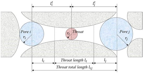 where , , and are the radii of pore i, pore j, and throat, respectively; and are the Euclidean distances between the centers of pore i and pore j to the throat center; α is the pore-throat segmentation coefficient to decide the pore–throat interface along the pore channels [], which is chosen to be 0.6 in this study.