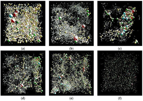 Pore network model of REV2 of different samples. (a) Carbonate rock A. (b) Carbonate rock B. (c) Carbonate rock C. (d) Carbonate rock D. (e) Carbonate rock E. (f) Sandstone S.