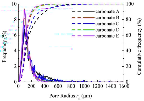 Figure 12 shows the distribution of pore radius in the REVs of the carbonate samples, from which positive skewness was observed for all the samples. The pore radius of carbonate was primarily in the range of 20–500 μm. Choquette and Pray [] classified the pores of carbonate into megapores (4–256 mm), mesopores (0.0625–4 mm) and micropores (<0.0625 mm) based on the pore diameter. According to their classification, macropores are not existent in any of the REV2s of the carbonate samples. The majority of pores in the REVs are mesopores. The average radius of the pores is significantly larger for samples A and C compared to samples B, D and E.