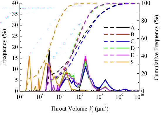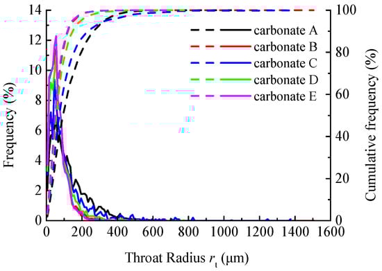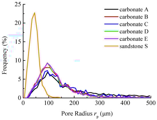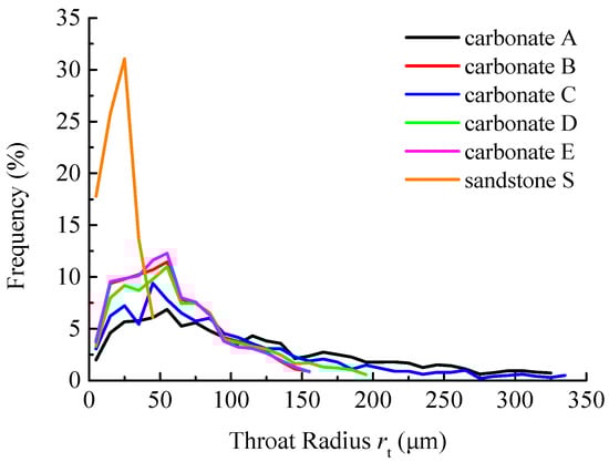 A comparison for the distribution of throat radius between the sandstone and the carbonate is provided in Figure 17, where a confidence interval of 95% was imposed. As shown in Figure 17, the average throat radius of carbonate was much larger than that of sandstone. The 95% confidence interval for the throat radius of sandstone was 0–60 μm (sample S), while for carbonate, it was 0–330 μm (samples A and C), 0–160 μm (samples B, D and E), respectively.