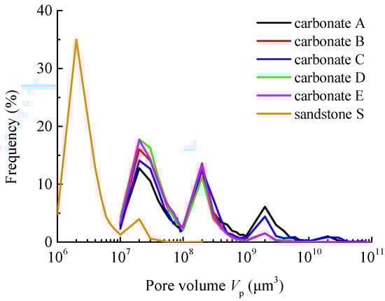 For the carbonate samples in Figure 14, the frequencies of the peaks decreased as the pore volume increased, indicating that small pores outnumbered large pores. The peaks in the distribution of pore volume of carbonate might be attributed to the size distribution of the grains, as grains of different sizes can form pores of different volumes during the sedimentary process. Large grains and poor gradation in carbonate can lead to large pore volumes. The peaks in the distribution of pore volume, which indicate pores of similar volume, may result from the sedimentation of grains with similar sizes. In the sandstone sample, the pore volume was not only small, but also prevailed in two orders of magnitude. This could be attributed to the small and uniform grain sizes as well as the compaction process when sandstone forms.