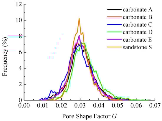 where A denotes the cross sectional area of a pore, P denotes the perimeter length of the cross section of a pore []. The shape factors of certain benchmark shapes of cross sections are: 0.0796 for a circle, 0.0722 for a regular hexagon, 0.0688 for a regular pentagon, 0.0625 for a square and 0.0481 for a regular triangle. As can be seen, the larger the value of the shape factor is, the more regular the shape of the cross section is. Figure 15 shows the distribution of shape factors for the pores in the carbonate and sandstone samples. Normal distribution was observed for the shape factor in all the samples. The values of the shape factor were primarily in the range of 0.015–0.045, indicating irregular triangular cross sections for the majority of pores. It can thus be inferred that the type of rock and the porosity have little effect on the shape of the pores.