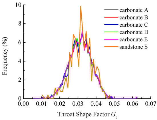 The factor of throat shape followed the same definition as the factor of pore shape in Section 5.1.3. The larger the value of the factor of throat shape, the more regular the shape of the cross section of the throat. Figure 19 shows the distribution of factors for the throat shape in the carbonate and sandstone samples. Normal distribution was observed for the shape factor in all the samples. The value of the shape factor was primarily in the range of 0.015–0.045, indicating irregular triangular cross sections for the majority of throats. By comparing Figure 15 and Figure 19, it can be seen that the distributions of the factors of pore and throat shape were similar. The type of rock and the porosity seem to have little effect on the shape of the throats.