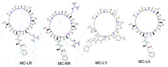 The marked differences in the toxicity of MC congeners are related to their chemical characteristics and their ability to distribute in different cellular compartments, according to their affinity to specific molecules. Therefore, toxicity among congeners can vary by several orders of magnitude [8]. The diversity of MCs is also related to different effects documented for this group of toxins, which include inducing apoptosis or cell proliferation [9], cancer development [10], inflammatory processes [11], metabolic disorders [12], and reproductive and neuronal alterations [13].