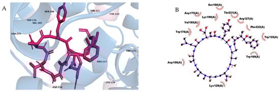 Most interactions of MC-LY with CD38 are hydrophobic, and binding to the active site of CD38 occurs through Trp 125 and Trp 189 (Figure 2), while connections with highly conserved residues such as Lys 129 and Thr 221 may affect essential ectoenzyme processes such as cADPR hydrolysis, and the necessary folding for cyclization and NAD glycohydrolase (NADasa) enzyme activity [22,26].