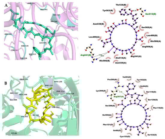 Interaction of MC-LA with TLR8 (A and B chains) (A), and TLR4 (A and D chains) (B). Figures on the right display atomic level views showing interactions between contact residues on the binding site and the ligand, as predicted by Ligand Scout. Atoms are colored with the CPK scheme.