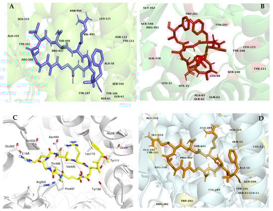 Angiotensin-I converting enzyme (ACE) is another enzyme that showed strong interactions with the four MC variants analyzed (Figure 4). ACE is a Zn2+ and Cl− dependent metalloprotein responsible for the metabolism of angiotensin I, whose imbalance alters blood pressure and induces congestive heart failure [52]. Microcystins showed superior affinities to this metallopeptide (Table 1), which has also been demonstrated experimentally, generating a variety of mechanisms that affect renal and cardiac function. The mechanisms include oxidative stress, generated by the release of cytochrome c, which triggers apoptosis to other mechanisms not yet elucidated [53,54,55].