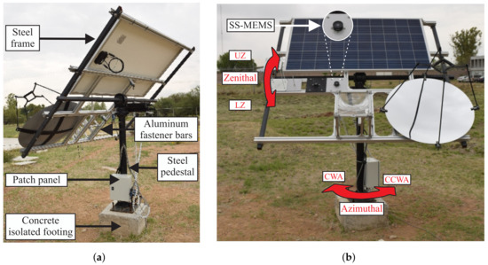 Figure 2a depicts the STS built. The steel pedestal is 2.3 m high and supports a commercial slew drive manufactured with a dual-axis motoreductor. This actuator moves a steel frame of 4 m, where the payload is placed. This system is anchored to the ground by a reinforced concrete isolated footing of 60 × 50 × 50 cm (height, weight and length). To easily assemble the payload, four aluminum profiles were placed on the steel frame. Since the solar tracker is designed for CSP and CPV applications, the desired solar tracking accuracy is <, so a PDE3 H-Fang slew drive was selected. The slew drive has two main components: a precise dual-shaft close-turn drive with a 62:1 worm gear ratio, and two motoreductors of 24 V of direct current (VDC) and 2.8 A (one for each axis: azimuth and zenith), which has a transmission ratio of 236:1. Therefore, the total gear reductions of the slewing drive on the azimuth and zenith axes are 14,632:1 (62 times 236). Because of the high level of reduction, if the motor is de-energized, it maintains its position. Each motoreductor has an absolute encoder with 8 pulses per revolution. The slew drive accuracy reported by the supplier is <; it has a small uncertainty due to the backlash. The rated output speed of the solar tracker is 0.12 revolutions per minute: it takes 4.16 min to rotate . It is fast enough, however, to track the Sun’s apparent position during the day. In order to avoid overturning the slewing drive and to ensure a robust operation, the system has four limit switches, as seen in Figure 2b: clockwise (CWA) and counterclockwise (CCWA) sensors on the azimuth axis and upper (UZ) and lower (LZ) sensors on the zenith axis. The range of motion of the STS is defined by the limits’ switches. Video 1 (https://youtu.be/GU-461boFCA, accessed on 20 January 2010) depicts a time-lapse video of the full motion of the system.