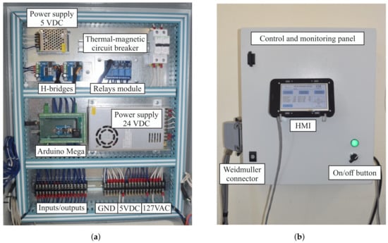 The developed system has a real-time control and monitoring system performed inexpensively and with easily accessible elements, as shown in Figure 4a. The main devices of the panel are as follows: an Arduino Mega 2560 as the central control unit, two BTS7960 H-bridges to drive the actuators by pulse width modulation (PWM) signals, two thermal-magnetic switches, a four-channel 5 V relay module, a DIN rail screw clamp terminal block, and two power supplies of 5 and 24 VDC. In addition, as seen in Figure 4b, the control panel has a teach pendant human–machine interface (HMI) used for monitoring and/or selecting the operation modes of the system. The HMI was performed on the Nextion touch screen NX8048T070, which sends/reads information of the Arduino embedded system. The costs of the solar tracker and its control and monitoring panel are described in Section 4.4.