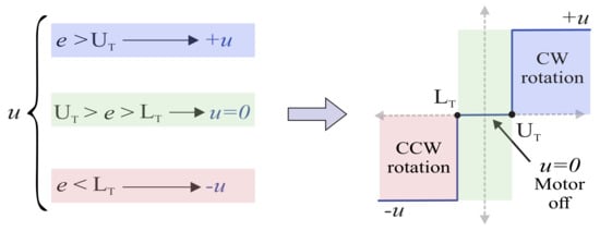 Thus, the calculated error e is used to determine the control signal (u) through a closed-loop on–off control. In this control system, the u value switches abruptly according to three possible conditions as seen in Figure 6, where and are, respectively, the lower and upper threshold of the allowed tracking hysteresis, which is commonly the same but with opposite signs. This threshold prevents excessive changes in the control signal because of the noise in the solar sensor. In the presented STS, the hysteresis has a value of ; however, the user can change it in the HMI. As observed in Figure 6, if the e value is greater than , u is positive, and, by means of the H-bridges, the motor turns clockwise on the azimuth axis and/or up in the zenith axis. On the contrary, if the e value is lower than the , u is negative and the motor turns counterclockwise in the azimuth axis and/or downward in the zenith axis to reduce the e. In the ideal case, when the e value is between the and , u is 0, and the actuators do not move. Video 4 (https://youtu.be/fz_K2xjqwJ8, accessed on 20 January 2010) shows the manual operation mode by desired angle. In this mode, the STS remains in its HP until the desired angle or reference value r is entered via the HMI screen. The system then begins its journey until it reaches the desired position: until the . The HMI displays the current e value. Note that the feedback produced by the encoders generates a closed-loop control. There is no solar tracking, however, since the STS tracks an established angular reference.