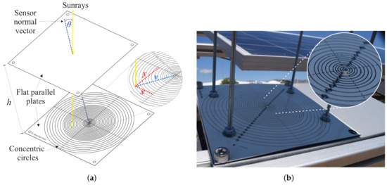 ISTE represents the actual angular difference between, where the tracker is pointing and where the Sun is at that moment [1]. The azimuth () and zenith () ISTEs can be directly observed by the digital sensor ISSX software, or they can be calculated with the PPS by Equations (11) and (12), respectively; where mm is the separation between the two parallel plates, x and y are the projections on the Cartesian plane of the distance between the centroid of the projection of the Sun’s rays and the center of the concentric circles of the PPS, as seen in Figure 8. It is important to mention that due to its construction, the PPS can only measure small angles since its FOV is about . As the standard suggests, the total ISTE () is obtained by Equation (13). Note that the total ISTE is always positive: