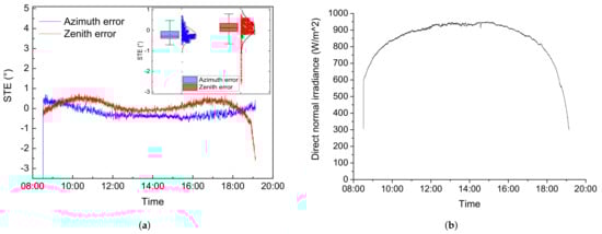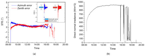 Solar tracking on 8 October 2021: (a) azimuth and zenith axes STEs and (b) DNI.
