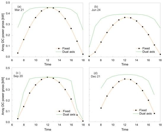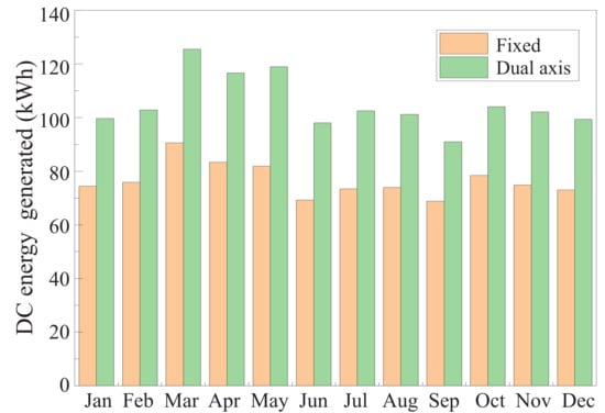 The detailed PV model of the System Advisor Model (SAM) was used to estimate the electrical output of a PV system. Module and inverter specifications were input into data along with the array information, such as the number of modules and inverters. SAM software performs power production estimations dynamically using typical meteorological year (TMY) information with a time step resolution of 1 h. In this way, it simulates the dynamic operating conditions of the PV system such as irradiance, ambient temperature, wind speed, etc., and determines their effect on energy production [40]. During the comparison, the fixed modules were oriented to the south with an inclination of 22, which is the optimal orientation for PV systems in Aguascalientes, Mexico (latitude N 215039 and longitude W 1022038). For the PV system with tracking, the losses caused by tracking error were set at 2. Figure 13 shows four representative scenarios for different months where the electric power generation is compared between a fixed PV system and a PV system with the developed dual-axis STS. Sunny days were selected for better comparison. As expected, on all days, the energy production with the tracking system was greater because the PV system receives radiation directly throughout the day. In the same way, Figure 14 summarizes the net DC electrical energy generated before the inverter throughout a year in Aguascalientes, Mexico. The developed STS allowed enhancing efficiency up to 37.5% compared to a fixed PV system.