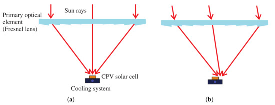 Despite the gain in energy production of a PV panel by using STSs, these systems are not usually used because of their high cost [41]. In contrast, in CPV and CSP systems, the STSs are mandatory because of the implementation of optics elements that redirect the Sun’s rays towards a specific target, which establish a significant angular dependence of the systems [42]. CPV technology has a higher performance than conventional photovoltaics since it can reach conversion efficiencies of over 47% [43]. Its construction and implementation, however, is more sophisticated. Energy generated by a CPV module is mainly affected by changes in irradiance levels, temperature, spectrum and, above all, by the misalignment of the module towards the Sun’s rays, as with any kind of PV device [44].