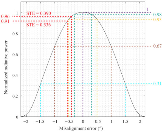 The script model followed in this simulation considers a CPV module with a 280 × 280 mm polymethylmethacrylate (PMMA) point focus commercial Fresnel lens and a 220 mm focal length. As a receiver, a flat surface of 10 × 10 mm is considered, simulating a multi-junction (MJ) solar cell. Four scenarios with different misalignment levels between the incident rays and the Fresnel lens were simulated in Tonatiuh software [47] to estimate the radiative flux distribution in the MJ cell, as shown in Figure 16. Considering an ideal situation in the first case, where the STE = , the normalized radiative power (NRP) is equal to 1, and the irradiance distribution is higher at the center of the MJ cell than at the edge, as Figure 16a illustrates. In the second case (STE = ), the STS presents a slight deviation; hence, the incident flux distribution moves towards an edge of the receiver, resulting in a 2% loss in the normal radiative power; see Figure 17. This behavior prevails as the STE increases, as shown in Figure 16c,d, with an STE of 0.5° and 1°, respectively. For these cases, the normal radiative power decays 7% and 33%, respectively. Figure 17 summarizes the relationship among normal radiative power and the STE. Note that the NRP decreases as the CPV module misalignment error increases. In addition, observe that the NRP decreases drastically when the absolute STE exceeds , which corresponds to an NRP = 0.9. This fact is linked to the acceptance angle of a CPV module, defined as the STE at which power generation decreases below 90% [45]. As seen in Figure 17, the NRP in the CPV cell is with the developed STS. On the one hand, with the mean STE achieved in sunny days (STE = 0.39), the NRP is equal to 0.96. On the other hand, with the mean STE of partially cloudy days (STE = 0.536), the NRP is to 0.91. In both cases, the mean NRP is greater than 0.9.