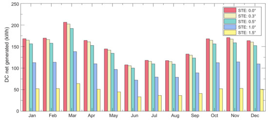 To estimate the DC electrical energy generated by two high concentration photovoltaic (HCPV) modules under different STEs, SAM software was used. The main parameters considered in the simulation were as follows: two 375.55 W HCPV modules of 20 cells with an efficiency of 37%, a concentration ratio of 700 suns, an optical error factor of 0.9, which takes into account the losses in the plane of array (POA) irradiance because of lens optical errors and a wind flutter factor of 0.01 m/s. There is a reduction in cell power value due to module motion caused by the wind; therefore, SAM reduces the cell output power each time step in the simulation according to 1-flutter loos factor × wind speed. The relative maximum powers of the CPV cells for different levels of STEs were obtained from the Tonatiuh simulation: 1, 0.98, 0.93, 0.67 and 0.31 for STE = , STE = , STE = , STE = and STE = , respectively, (see Figure 17). It is important to mention that the STE or pointing error is the sum of different types of errors, some which are slowly time-varying, such as the misalignment error, and others of highly dynamic behavior, such as those due to wind loads and the control system [12]. In the simulation, it was assumed that the errors due to the control system and misalignment errors were constant over time and its effect was considered in the SAM’s misalignment coefficient, which was determined, as shown in Figure 17. The only transient error simulated was that caused by wind loads at the location. The simulation was performed for Aguascalientes, Mexico (latitude N 215039 and longitude W 1022038). Figure 18 represents the monthly DC electrical energy generated by the modules. It is important to note that when the absolute value of the STE is less than , the energy generated by the CPV modules is greater than 90% of its capacity. On the contrary, when the absolute value of the STE is greater than , the generation drops drastically. Therefore, the STS developed in this work will allow the CPV modules to reach at least 90% of their energy conversion efficiency both on sunny and partly cloudy days.