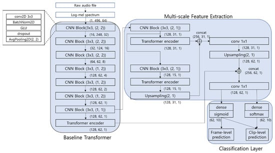 The architecture of the proposed Transformer model is shown in Figure 2. The architecture was motivated from the feature-pyramid network based on CRNN [22]. It consists of three parts: the baseline Transformer, a multi-scale feature extraction part, and a classification layer. The baseline Transformer consists of seven convolution blocks (ConvBlocks) and one Transformer encoder, which is depicted in Figure 1. The parameters of the CNN block and Transformer encoder in the baseline Transformer were mainly determined by referencing the work in [25]. The input features of the baseline Transformer are 64-dimensional log-Mel spectrograms extracted with a window size of 1024 sample points and a hop length of 323 points. The length of the input frames is 496 frames, corresponding to 10 s of each audio clip with a sampling rate of 16 kHz. The spectrogram is constructed as a two-dimensional (496 × 64) feature map.