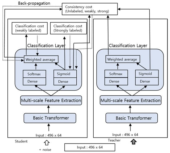 The mean-teacher model employed in this study is similar to the one used in the baseline recognizer of the DCASE 2019 Challenge task 4 [1]. However, instead of using the CRNN, the proposed Transformer model was employed in the mean-teacher model. The architecture of the mean-teacher model is illustrated in Figure 4.