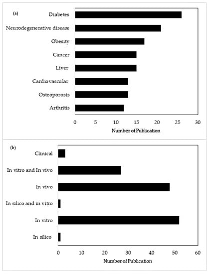 Number of publications on functional seaweed and chronic disease based on (a) the type of chronic disease and (b) the experimental model.