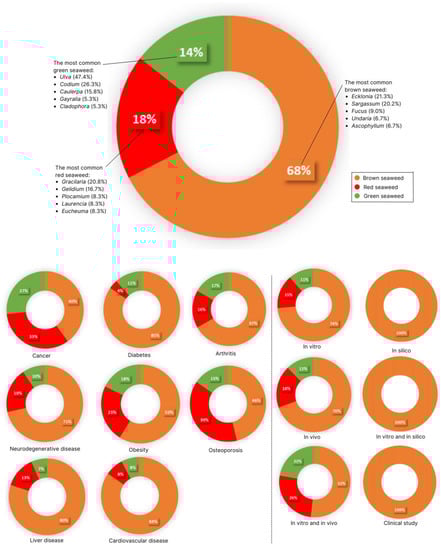 We summarized seaweed research on chronic disease based on three groups of seaweeds: brown (Phaeophyceae), red (Rhodophyceae), and green (Chlorophyceae) (Figure 2). Studies of chronic disease were conducted on brown seaweed (68%), red seaweed (18%), and green seaweed (14%). Among the brown seaweeds, the most studied species were Ecklonia (21.3%), Sargassum (20.2%), and Fucus (9%). In red seaweed, Gracilaria (20.8%) and Gelidium (16.7%) were the top two most studied species for potential use in the treatment of chronic diseases. The most studied green seaweed species were Ulva (47.4%), Codium (26.3%), and Caulerpa (15.8%). The phylum of Phaeophyta was the most studied species on cancer (40%), diabetes (85%), arthritis (67%), neurodegenerative diseases (71%), obesity (59%), osteoporosis (46%), liver disease (80%) and cardiovascular disease (84%). The studies of seaweed in treating chronic diseases were conducted in vivo, in vitro, in silico and as clinical studies. There was a lack of clinical studies conducted; however, a clinical study was conducted to test a Maritech® seaweed extract formulation containing extract of Fucus vesiculosis, Macrocystis pyrifera, and Laminaria japonica on osteoarthritis patients [36]. The study showed that seaweed extract can reduce the symptoms of osteoarthritis in a dose-dependent manner.