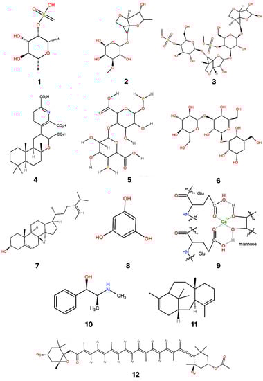 The chemical structures of fucoidan (1), agars (2), kappa carrageenans (3), ulvans (4), alginates (5), laminarin (6), fucosterol (7), phlorotannins (8), lectins (9), alkaloids (10), diterpenes (11), and fucoxanthin (12).