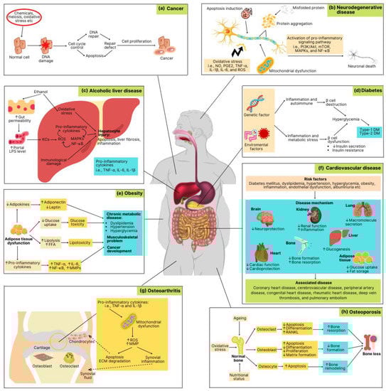 Mechanisms of chronic diseases, including cancer (a), neurodegenerative disease (b), alcoholic liver disease (c), diabetes (d), obesity (e), cardiovascular disease (f), osteoarthritis (g) and osteoporosis (h).