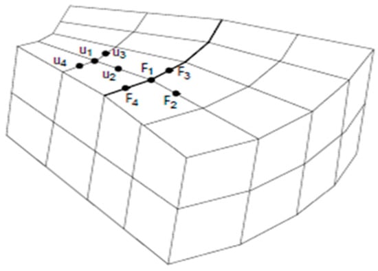 where (wi) is the element length and (s) is the distance along the crack front, the distance between the crack tip and the point of surface crack is r, the distance of crack extension is Δa and the displacement in the y-direction is Δv during the crack extension when the normal stress (σy) is acting along the closed crack surface (line). The results of the node forces (F) ahead of the crack front and the node displacements behind the crack front for the ith segment with contributions for elements on each side of the crack front. For mode 1 planar crack is estimated with node 8 element as describe by [29] in Equation (7). The X and Z, respectively are the tangential (x-axis) and normal (z-axis) components of the nodal forces, while ∆u and ∆v are the corresponding relative displacement variation of the nodes.
