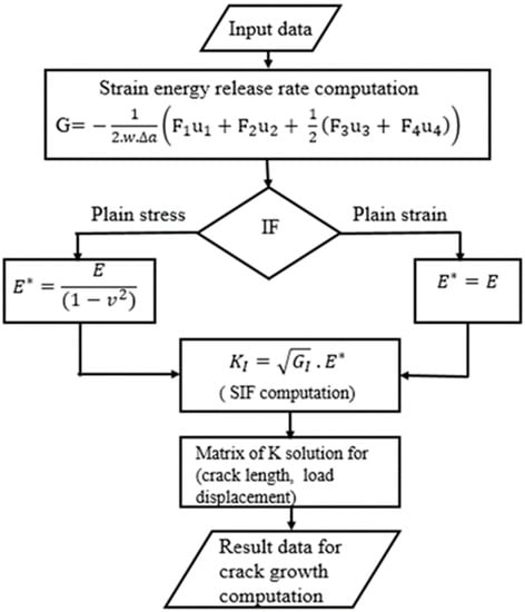 For 3D solid conditions, the evaluation is carried out separately for each node along the crack front of the model as illustrated in Figure 3. u is crack opening displacement at crack face. For the case of higher-order elements, the contributions from the mid-side nodes included as the obtained strain energy release rate GImax and GImin in fatigue loading are calculated based on Equations (8) and (9). The simplified representation of the numerical procedure implemented in program VCCT for SIF based on energy release rate solver is illustrated Figure 4.