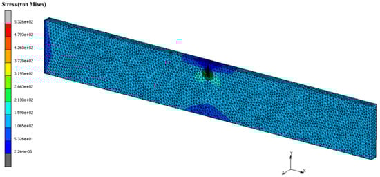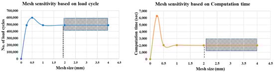 The software-running environment is 12-GB RAM, CPU 3.10 GHz, and Intel-i5 processors. Firstly, multiple files with different mesh size/number of elements are created to verify the mesh size dependency on the crack propagation rate and the corresponding number of load cycles. The analysis in Figure 6 determines the choice of 2 mm mesh size. Secondly, the crack front radius is determined from a distance between nodes along the front [20]. Because of the complicated stress field singularity along the crack front, a compact mesh must be produced and regenerated as the crack grows [32]. The adaptive remeshing (in this case, the faceted surface in simulation software) with initial quarter-point element behaviour is computed with 2 mm. The broken line indicates the adopted mesh size within the numerical FE analysis.
