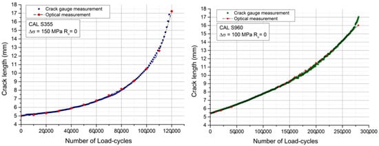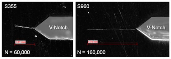 The crack growth rate for the processing of experimental data, a method based on an incremental polynomial method was used. The test rig is paused at an interval of 10,000 cycles to take the optical measurement and the crack notch was taken as the datum, the final dimension is illustrated in Figure 7. The crack length of the specimen was verified alongside load cycles in Figure 8, for the S355 and S960 for the crack gauge and optical measurement, respectively. Both methods of measurement evaluation agree with the fatigue crack growth rate performed according to ASTM E647. The slight deviation in both techniques could be attributed to the little asymmetric crack growth on the opposite side of the specimen.