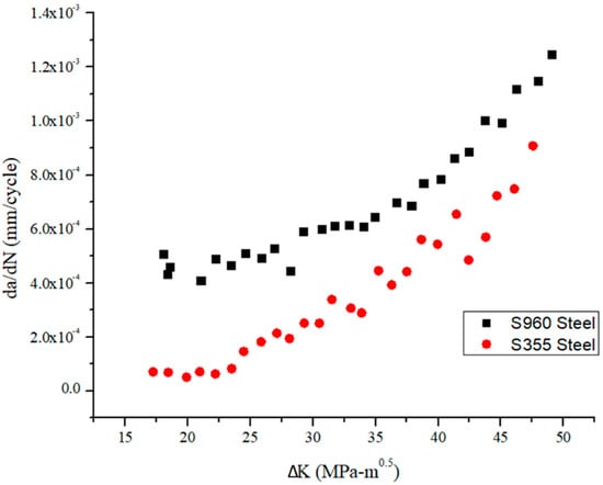 The FCGR (da/dN) plotted as a function SIF range obtained from the experiment is illustrated in Figure 9 which characterizes the resistance of a material to the stable crack extension under cyclic loading. From the values of ∆K, there is a slight difference observed between the S355 and S960 steel. However, the gap between this crack growth rate is faster in S960 when ∆K values increases.
