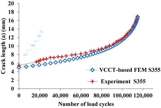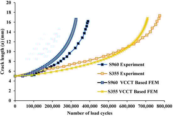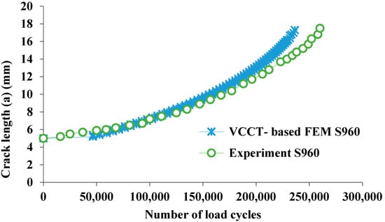 The value of the stress ratio R has a very strong effect on the crack growth rate, the simulation of 3D FEM model with a stress ratio R = 0.1 and applied CAL of 62.5 MPa for S355 and S960 steel performed. The predicted crack length plot as a function of load cycle counts is presented in Figure 13. Furthermore, Table 4 displays the percentage error based on the number of load cycles at the crack length of 17 mm for both steels.