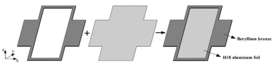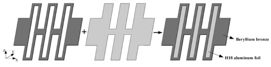 The schematic diagram of a DL-LET joint is shown in Figure 1. H18 aluminum foil has the advantages of large Young’s modulus and high strength while maintaining good toughness. Beryllium bronze has obvious superiorities in terms of strength, mechanical property, and fatigue resistance. Therefore, the two materials are selected as layers in the DL-LET joint, respectively. Using strong welding adhesive, the LET joint of beryllium bronze is bonded to the H18 aluminum foil, which is consistent with the overall dimensions of the joint.