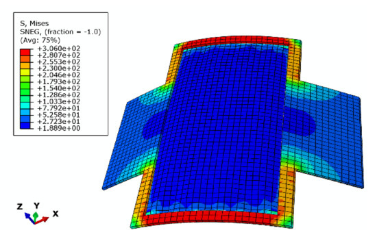 The stress distribution in the joint is shown in Figure 4 when a bending moment of 50 N·mm is applied. The H18 aluminum foil is so thin that the stress is negligible during deflection. The largest stress occurs in the beryllium bronze layer. At this point, the bending angle of the joint is 0.414 rad, and the maximum equivalent stress of the beryllium bronze layer is 306.0 MPa, which is smaller than the yield limit of beryllium bronze [sy] = 1170 MPa. The maximum equivalent stress of H18 aluminum foil is 113.5 MPa, which is smaller than the yield limit of H18 aluminum foil, [sy] = 124 MPa. Therefore, the plastic deformation will not occur and meet the design requirements.