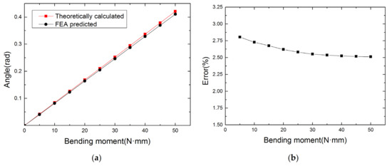 Under different bending moments, the comparison between the theoretical and simulation values of the rotation angles is shown in Figure 5a, and the errors are shown in Figure 5b. It can be seen from Figure 5a that the theoretical values are consistent with the simulation values, showing an excellent linear relationship. It can be seen from Figure 5b that with the increase of bending moment, the relative error decreases slightly, and all errors are within 3%, which proves the correctness of the theoretical calculation method.
