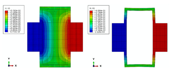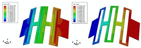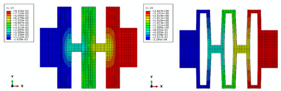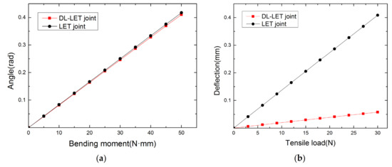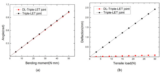 Using Abaqus, the deformations of the DL-Triple-LET and Triple-LET joints subject to a bending moment of 50 N·mm and are shown in Figure 14, and the deformation of the DL-Triple-LET and Triple-LET joints with a tensile load of 30 N is shown in Figure 15. It can be seen from Figure 14 and Figure 15 that the value of deflection of Triple-LET is 28.8 times larger than that of the DL-Triple-LET joint, while the bending stiffness is almost the same. Figure 16 shows the trends of the simulation values of the two joints under different bending moments and tensile loads.