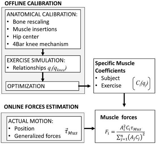 Figure 2 summarizes the two stages to apply the model: an offline calibration stage, and an online muscle and joint force calculation stage. The offline calibration stage consists of performing kinematic exercises for the anatomical, functional, and kinematic calibration of the model. The anatomical and functional calibration provides (1) the size of the modeled bone, (2) the parameters of the joints (HJC and four-bar mechanism), (3) the points of insertion of the muscles, and (4) the scale of the inertia parameters. This calibration is followed by a series of rehabilitation exercises to obtain the functional relationships between the kinematic variables. The workspace is discretized, and the coefficients of muscle force are calculated.