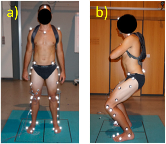 Experimental setup. (a) Subject in a standing upright position, as used for the static trial (b) Subject performing the squat.