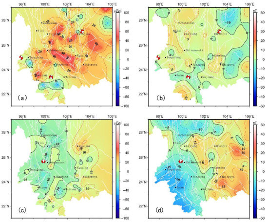 The spatial distribution of the annual difference in gravity and magnetic anomaly fields for each of the two years that precede strong earthquakes in the Yunnan area. (a) Annual changes in gravity from 2013 to 2014; (b) Annual changes in total geomagnetism from 2013 to 2014; (c) Annual changes in gravity from 2019 to 2020; (d) Annual changes in geomagnetism from 2019 to 2020. Epicenter and focal mechanism are shown for earthquakes that occurred within a year of the respective time period end.