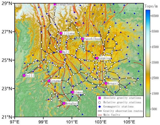 There are 249 gravity measurement points in Yunnan Province and its surrounding areas, including nine absolute gravity points. The absolute observation adopts the FG-5 absolute gravimeter, and the observation accuracy is 2 × 10−8 m·s−2. The relative observation instrument is CG-5. The relative gravimeter has an observation accuracy of 10 × 10−8 m·s−2; there are 130 geomagnetic vector measurement points, of which the GSM-19T proton precession magnetometer (PPM) is used to observe the total geomagnetic intensity, the instrument resolution is 0.1 nT, and the observation accuracy is 0.5 nT.