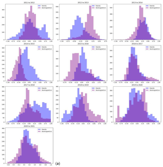 The number distribution of normalized gravity change and total intensity change is in the interval [−1,1]. The overlap of the two intervals represents the number of grid points with the same normalized change in the entire area. The nuclear density curve is also used to visually indicate the overlap of the two intervals. The area enclosed by the nuclear density curve is 1. The larger the upper limit of the vertical axis of the nuclear density graph is, the more concentrated the data change range is near 0, and the more overlapped the area is. More means that the more grid points with the same amount of change, the more consistent the change trend is. The histogram and nuclear density diagram of the uniform number of grid point changes in the normalized gravity field and magnetic field from 2011 to 2021 are shown in Figure 3.
