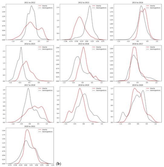 As shown in the above figures, from 2011 to 2012 and from 2012 to 2013, the degree of coincidence for the same interval of gravity and magnetic field changes was low; the difference in the kernel density map was large. From 2013 to 2014, the overlap interval between the gravity and total intensity changes was approximately −0.2 to 0.6; the peak value on the gravity change curve in the kernel density graph was slightly greater than 2.0, the peak value of the total intensity change was slightly less than 2.0, and the difference between them was approximately 0.25. Three earthquakes with magnitudes of 6.0 or greater occurred in one year from 2014 to 2015. The overlap interval between the change in the gravity and the change in the total intensity was approximately −0.75; the peak value on the gravity change curve in the kernel density graph was approximately 2.8, and the peak value of the total intensity change was approximately 1.6. The difference between them was approximately 1.2. From 2015 to 2016, 2016 to 2017, 2017 to 2018, and 2018 to 2019, the gravity magnetic coincidence degree was the best from 2016 to 2017, but the kernel density difference was large. Six earthquakes with magnitudes of 5.0 and greater occurred during this period, and no strong earthquakes occurred. From 2019 to 2020, the coincident range of gravity variation and total intensity variation was approximately −0.75 to 0.75. In the kernel density diagram, the peak value of the gravity variation curve was approximately 1.1, and the peak value of the total intensity variation was approximately 1.2, with a difference of approximately 0.1. From 2020 to 2021, an earthquake with a magnitude of 6.4 occurred.