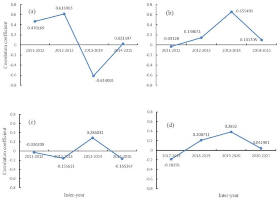 According to the analysis of gravity anomaly indicators, the range of gravity anomalies for earthquakes with magnitudes 6.0 to 7.0 is 220 to 350 km [17]. The data gridding and normalization of the seismic anomaly area were performed on Yingjiang 6.1, Ludian 6.5, Jinggu 6.6, and Yangbi 6.4, and the correlation analysis of the annual change data of the gravity and magnetic field was performed. According to Formula (4), the correlation coefficient of annual variation data of gravity and magnetic field from 2011 to 2021 is shown in Figure 4.