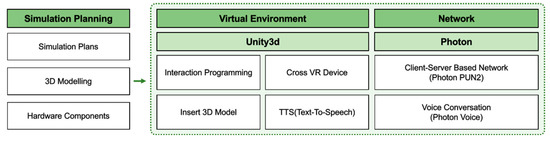 Next, we divided the simulation production into a virtual environment and a network. First, we used Unity3D to build a virtual environment. This virtual environment was programmed in Visual Studio and developed as a heterogeneous type that can be used without restrictions on VR devices to ensure high versatility. The tested VR device models were Oculus Rift S, Quest2, and HTC Vive Pro Eye, all of which were confirmed to work. We implemented 3D models that were necessary for environmental configuration, as well as a virtual avatar that acts as the user’s agent. Finally, we implemented Text-To-Speech (TTS), a speech synthesis function for smooth interaction between users and objects.