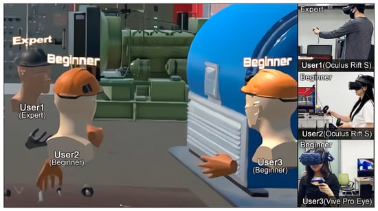 Figure 2 shows a simulation designed for the demonstration testing. Prior to the experiment, a demo model was created and tested to confirm that efficient training and interaction are possible with the proposed system. The test assesses the proficiency of the tools required for engineering and involves three people, the minimum standard for multi-user participation. All three users accessed the simulation simultaneously in different locations via different PCs, VR devices, and networks. Two users used an Oculus Rift S, whereas the other had an HTC Vive Pro Eye. The users were instructed to put on the VR devices after playing the simulation on a PC.