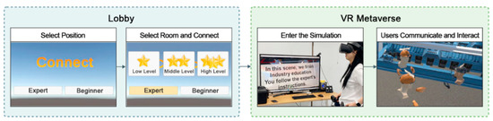 Figure 3 shows the test procedure. First, the user selects a role in the lobby between Expert and Beginner. In the demo test, one user was an Expert and the other two were Beginners. All three users selected the same mid-level room for entry. At this stage, the network environment must be smooth so that all users can meet in the same virtual environment. Upon entering the room, users can receive guidance regarding the simulation through TTS. This guidance describes the features included in the simulation and how to use them. Finally, the expert user explains the tools on the workbench to the beginner users. In addition, beginners can learn how to use these tools directly in a virtual environment. During these demo tests, it was confirmed that expert and beginner users can interact normally.