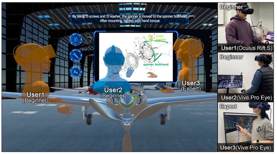 The operation of the proposed system has been verified through demonstration tests and an aircraft maintenance simulation was developed, as shown in Figure 4. This simulation was proposed as educational material for aircraft maintenance procedures, equipment, and terminology. We selected an unfamiliar topic to examine the educational effects on the subjects. The aircraft model is the KT-100, an introductory aircraft modified from Korea’s first civilian aircraft, the KC-100. The simulation contains the maintenance process of the KT-100 based on our system. Therefore, multiple users can access the process based on a single aircraft and multi-party interaction is possible. The actions of all users are shared, and thus the maintenance process can be carried out together. In this experiment, an expert user and a beginner user learned the training content together. The purpose of this study was to confirm the educational qualities and presence offered by our system compared with those offered by video education.